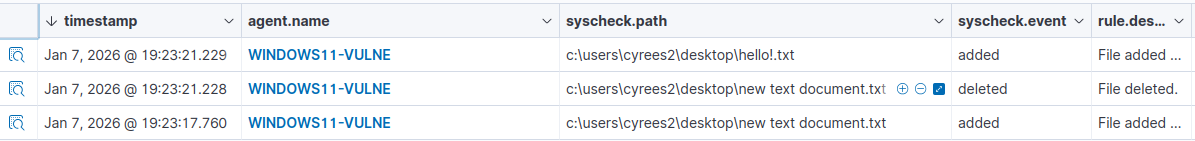 All generated events were successfully forwarded to the Wazuh manager and visualized through the dashboard, demonstrating effective endpoint visibility, and alert correlation.