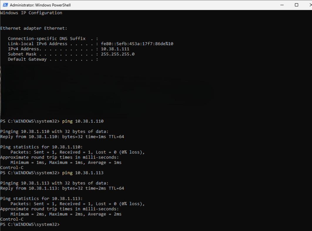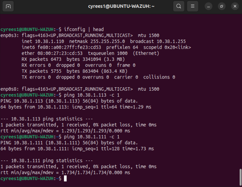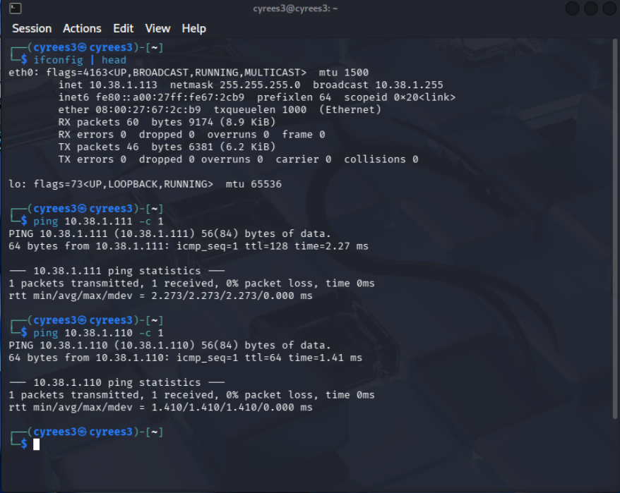 These tests confirmed proper DHCP operation, correct network segmentation, and full internal communication.