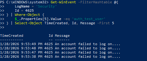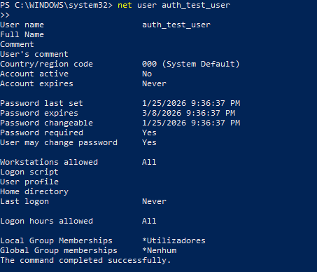 - Account disabled or inactive: Confirmed the account was disabled, preventing authentication (Checked using: net user auth_test_user)