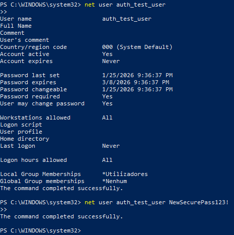 - Reset user credentials to restore access (Command used: net user auth_test_user NewSecurePass123!)